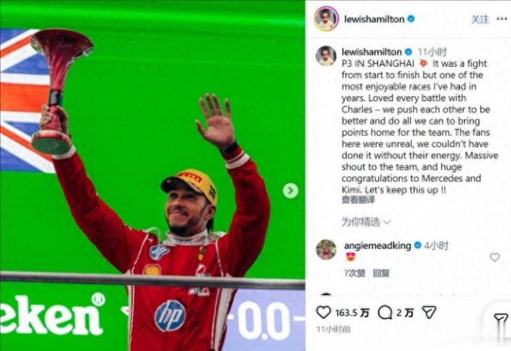F1 中国大奖赛认真遣散,代表法拉利出战的汉密尔顿发扬出色,最终以第三名登上领奖台。赛后,他在酬酢媒体上共享了比赛感受,并向现场的中国车迷抒发感谢。
